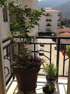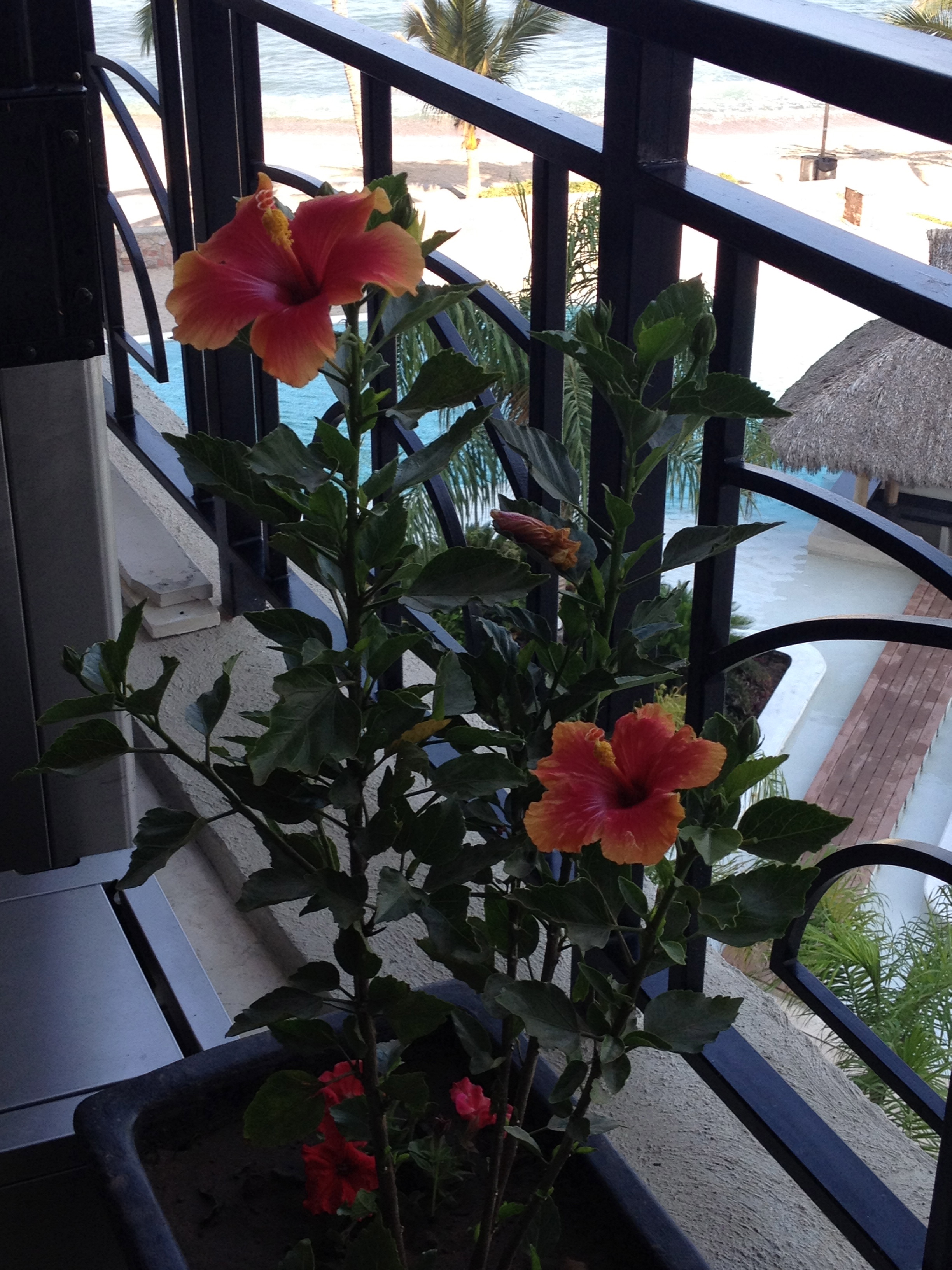 One of favorite  things to do is play with plants.  Although I enjoy looking at beautiful landscaping, I have discovered that I really don’t need or want a big yard I have to take care of.  I love to create a little garden with pots on our decks.  I like color, fragrance and some things I can use.  I finally felt like I had things figured out in Seattle.  Learned the hard way that it is not warm enough long enough to grow lemons on my Meyer’s lemon tree or gardenia plants that actually bloom the flower, but lots of beautiful plants to choose from in Seattle.  Now I find myself needing to learn how to plant in a tropical environment with plenty of sun!  I love the color options to choose from in PV and I now have 8 limes on our lime tree along with the wonderful fragrance from the citrus flower.  Growing basil, oregano, and mint and am trying my hand at a gardenia plant again because they are suppose to bloom all year long down here.  I’ve kept an orchid alive for almost two months and even bought a little fern to see if I can keep it alive!  I love our little garden I have created!  Too many plants to show them all to you, but will share a few.