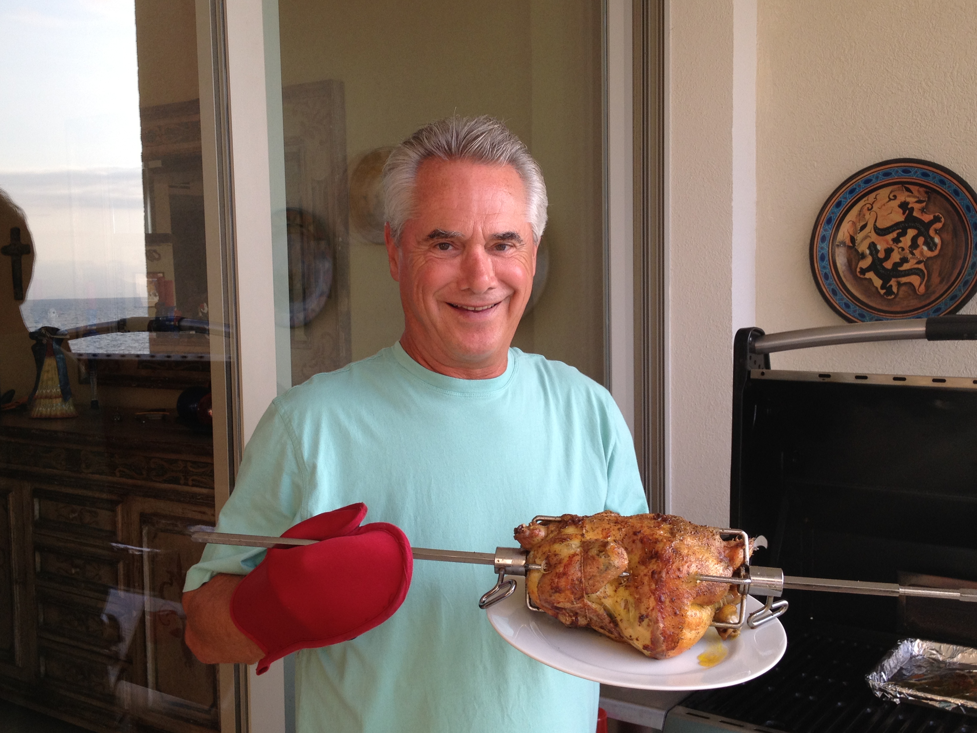 When we drove our trailer down to PV from Seattle, we loaded it with our favorite things.  Our home was completely furnished down here, but we wanted some of those dishes, linens and a few other items that remind us this is our home.  Our trailer could only weigh 3500 lbs and after adjusting some items and leaving some things out, we weighed in at 3470 lbs!  The reason for this story is Bob’s barbecue.  It was either Bob’s barbecue or one of my favorite pieces of furniture.  As you can tell from the photo, Bob’s grill won and I am glad it did!  We use it almost every night and my Esposo can grill.  He decided to do one of our favorites which is a rotisserie chicken.  Cut some herbs from our little garden on our back deck, brined it and then Bob worked his magic!